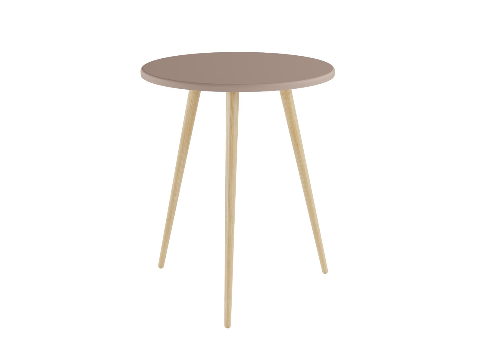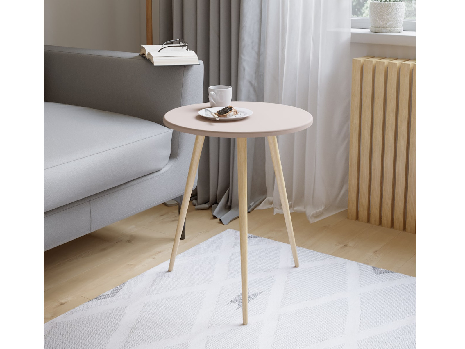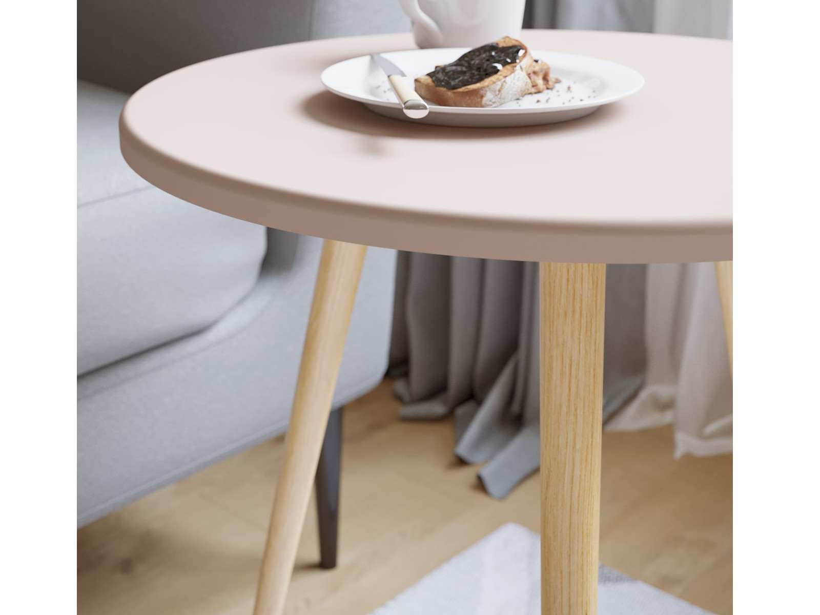 В дизайне использована простая геометрия столешницы в сочетании с деревянными опорами.