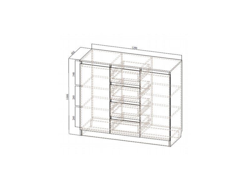 В среднем отделении шириной 384 мм размещаютсяс 4 выдвижных ящика глубиной 400 мм.