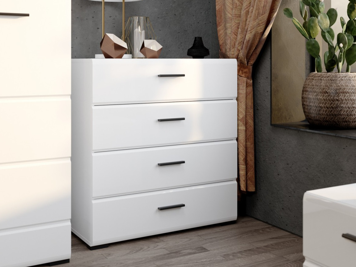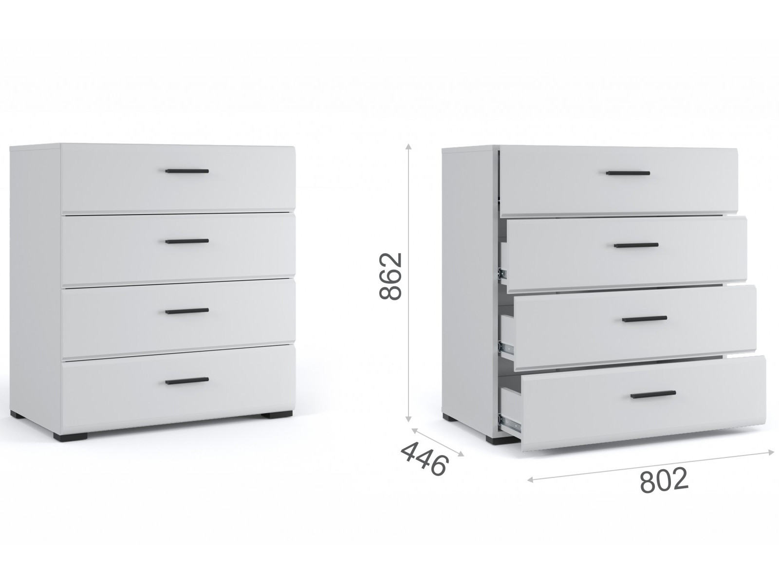 - Горизонтальная фрезеровка фасадов, контрастные черного цвета ручки и задняя стенка из ХДФ, элегантный белый цвет — всё это делает модель универсальной, позволяет сочетать её с любой мебелью и отделкой.