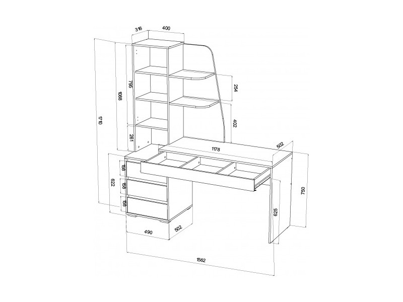 - Три ящика в тумбе + Один широкий ящик под столешницей.