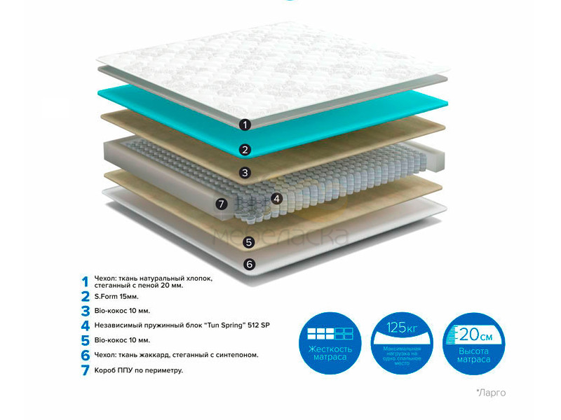 Наполнение : Блок независимых пружин + S.Form 15 мм + био-кокос 10 мм + усиление по периметру коробом ППУ