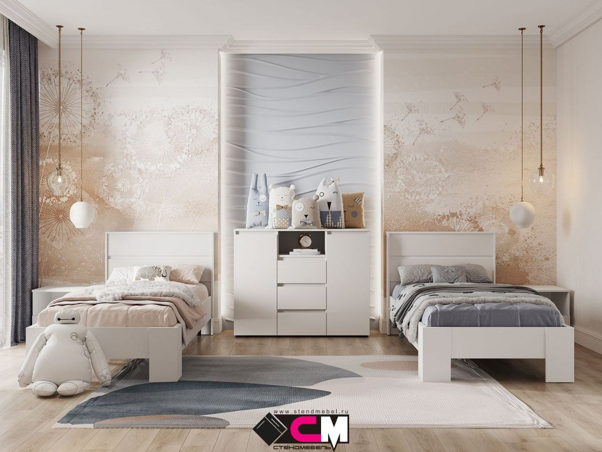 Цена за комплект на фото: КР 01 Кровать (2 шт), КМ 01 Комод, ТБ 01 Тумба прикроватная (2 шт)