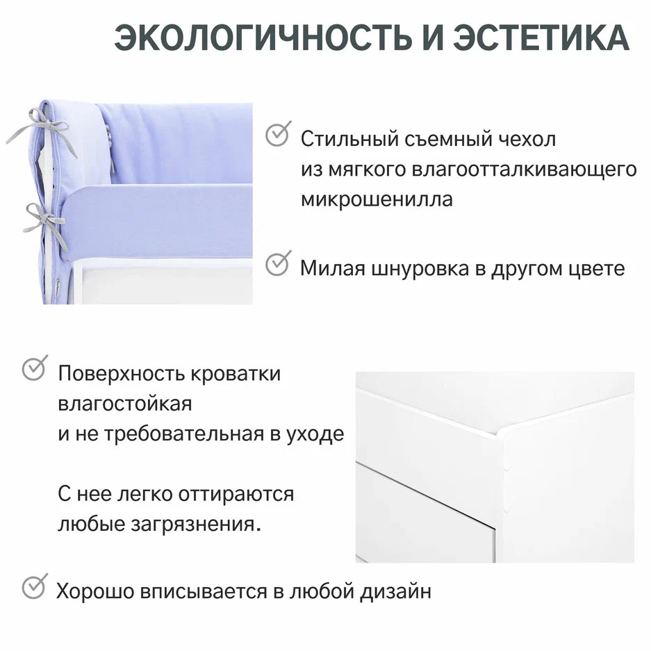 Чтобы не бояться, что ребенок упадет с кроватки, можно приобрести дополнительный съемный бортик.
