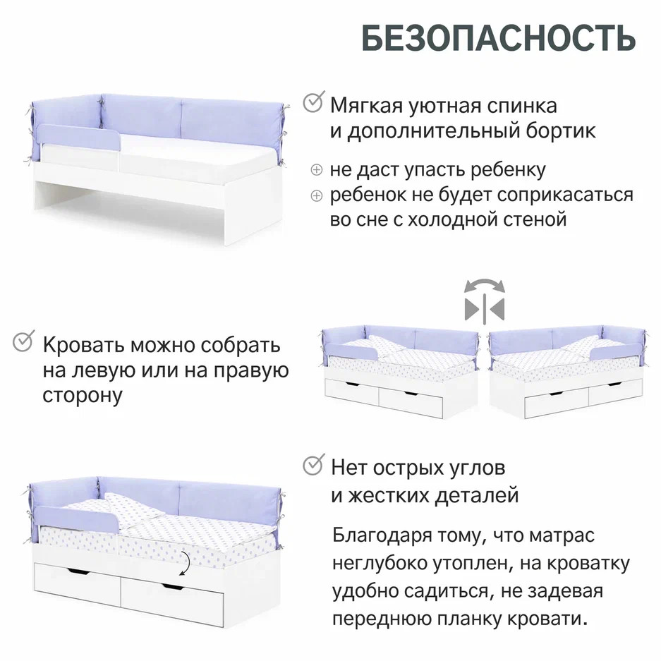 Чтобы не бояться, что ребенок упадет с кроватки, можно приобрести дополнительный съемный бортик.