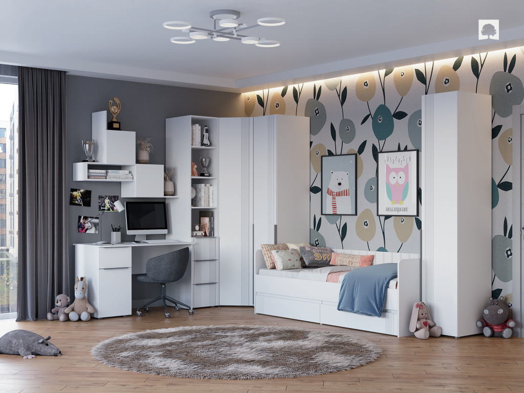 Цена за комплект: Стол письменный ПРАВЫЙ, Полка настенная №2, Шкаф 3-ств с зеркалом, Кровать 0,9, Настил 90