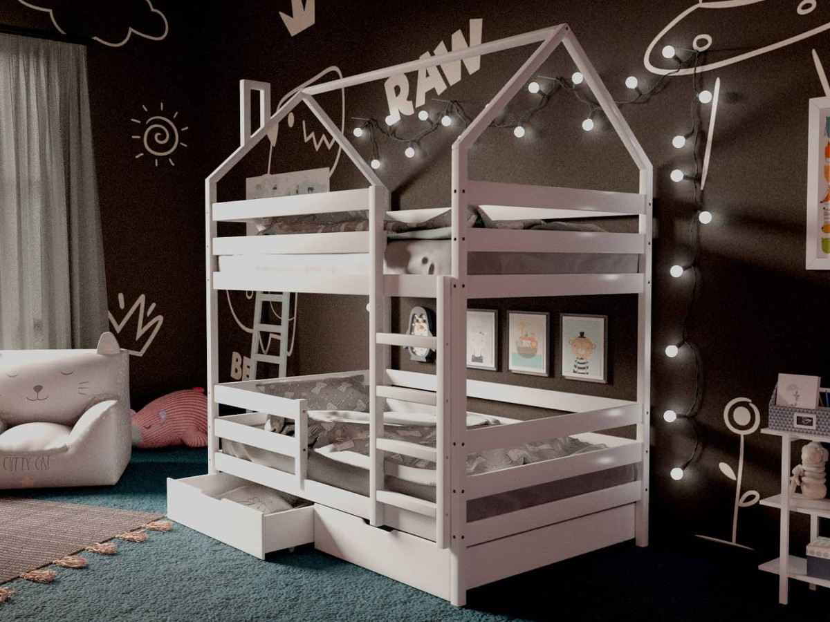 - Двухъярусная кровать-домик белый 80х160 см с ящиками