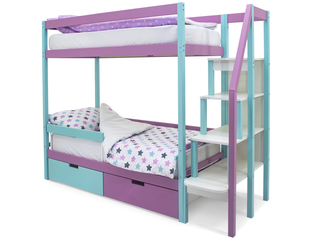 Двухъярусная кровать Svogen с ящиками и бортиком мятный-лаванда