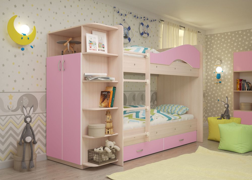 - Двухъярусная кровать со шкафом Мая латофлексы розовый