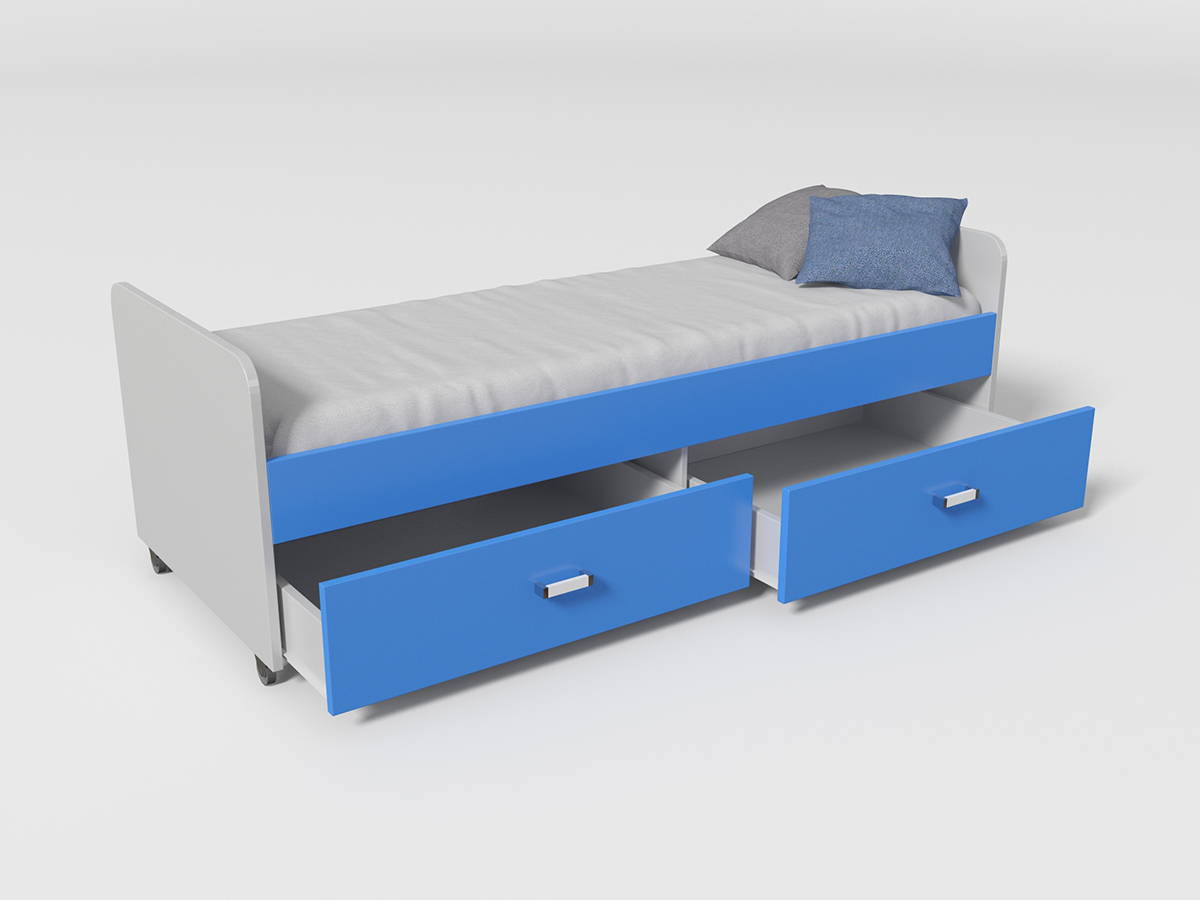 Нижняя кровать выкатывается на роликах и так же имеет полноценное спальное место и два вместительных ящика для белья или игрушек. При желании нижнюю кровать можно поставить отдельно.