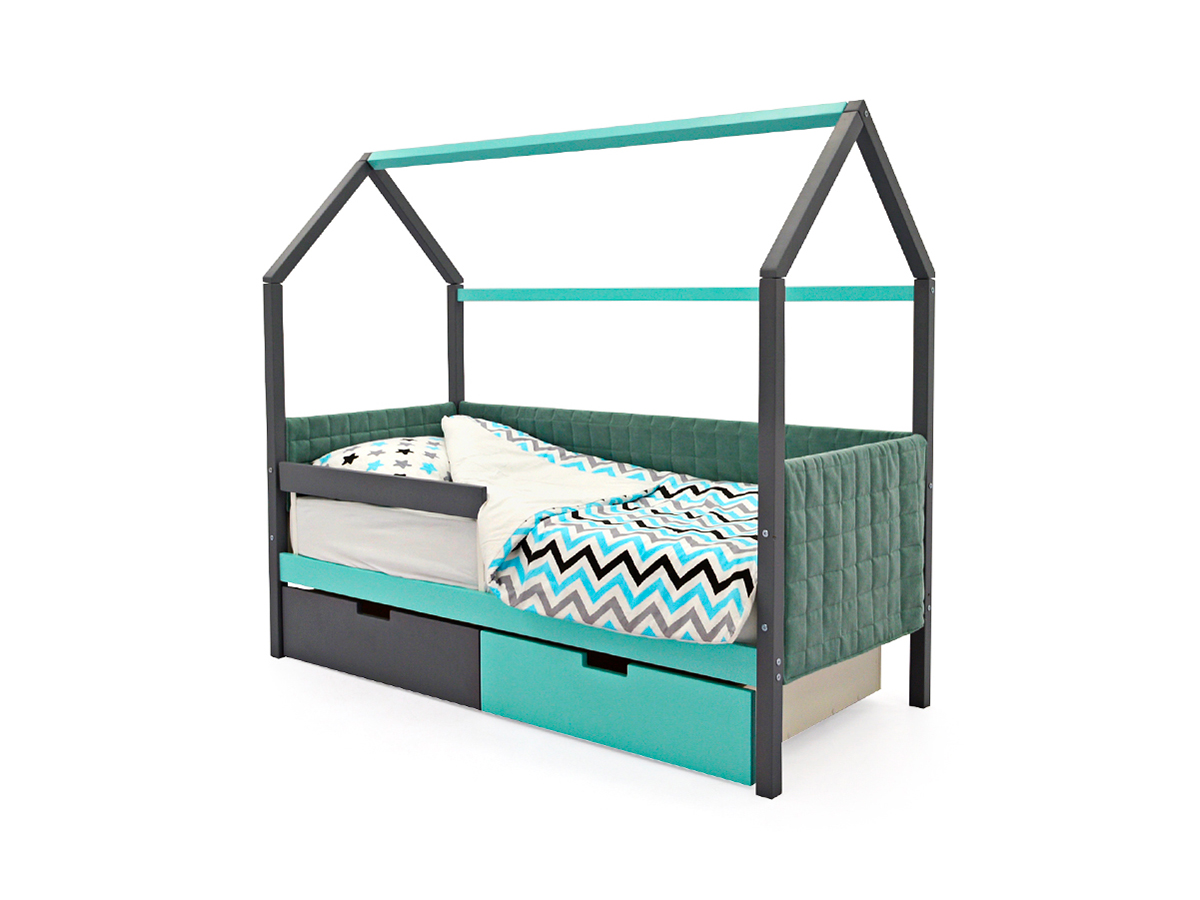 - Кровать-домик мягкий Svogen с ящиками и бортиком графит-мятный