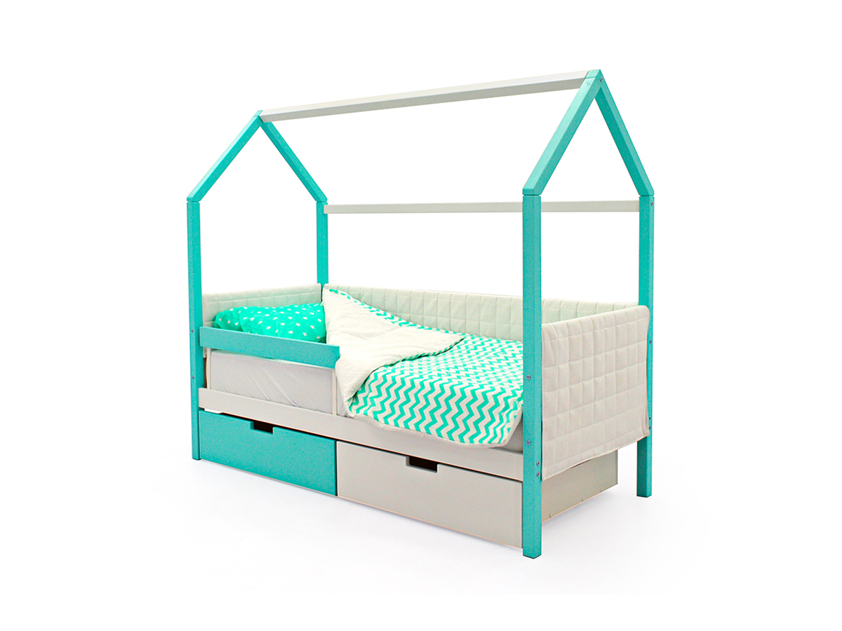 - Кровать-домик мягкий Svogen с ящиками и бортиком мятно-белый