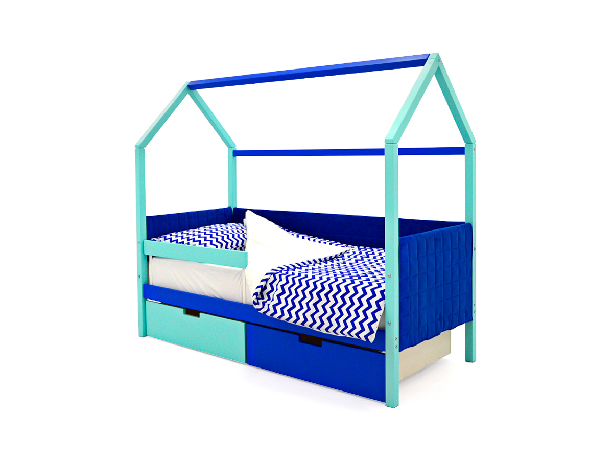 - Кровать-домик мягкий Svogen с ящиками и бортиком мятно-синий
