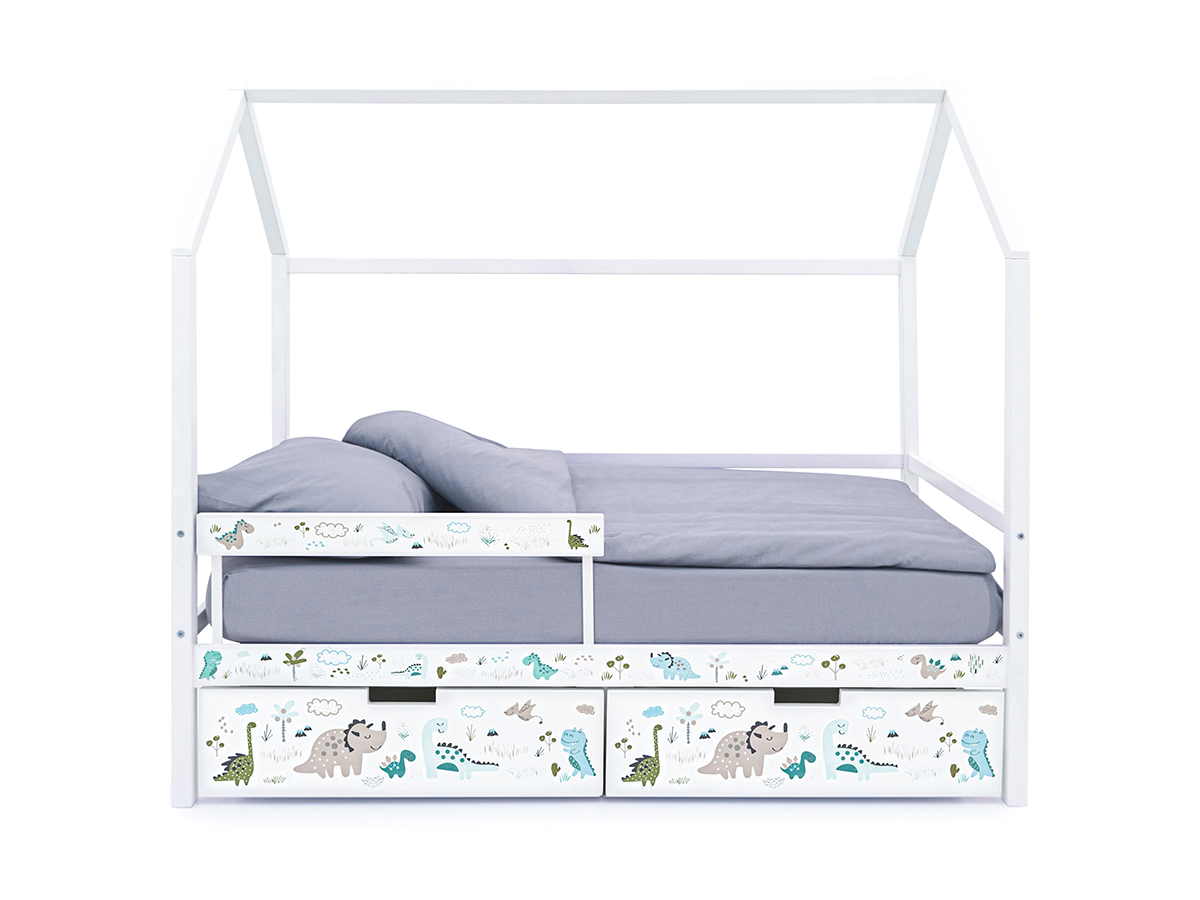 - Кровать-домик Svogen с фото с ящиками и бортиком белый/динозаврики