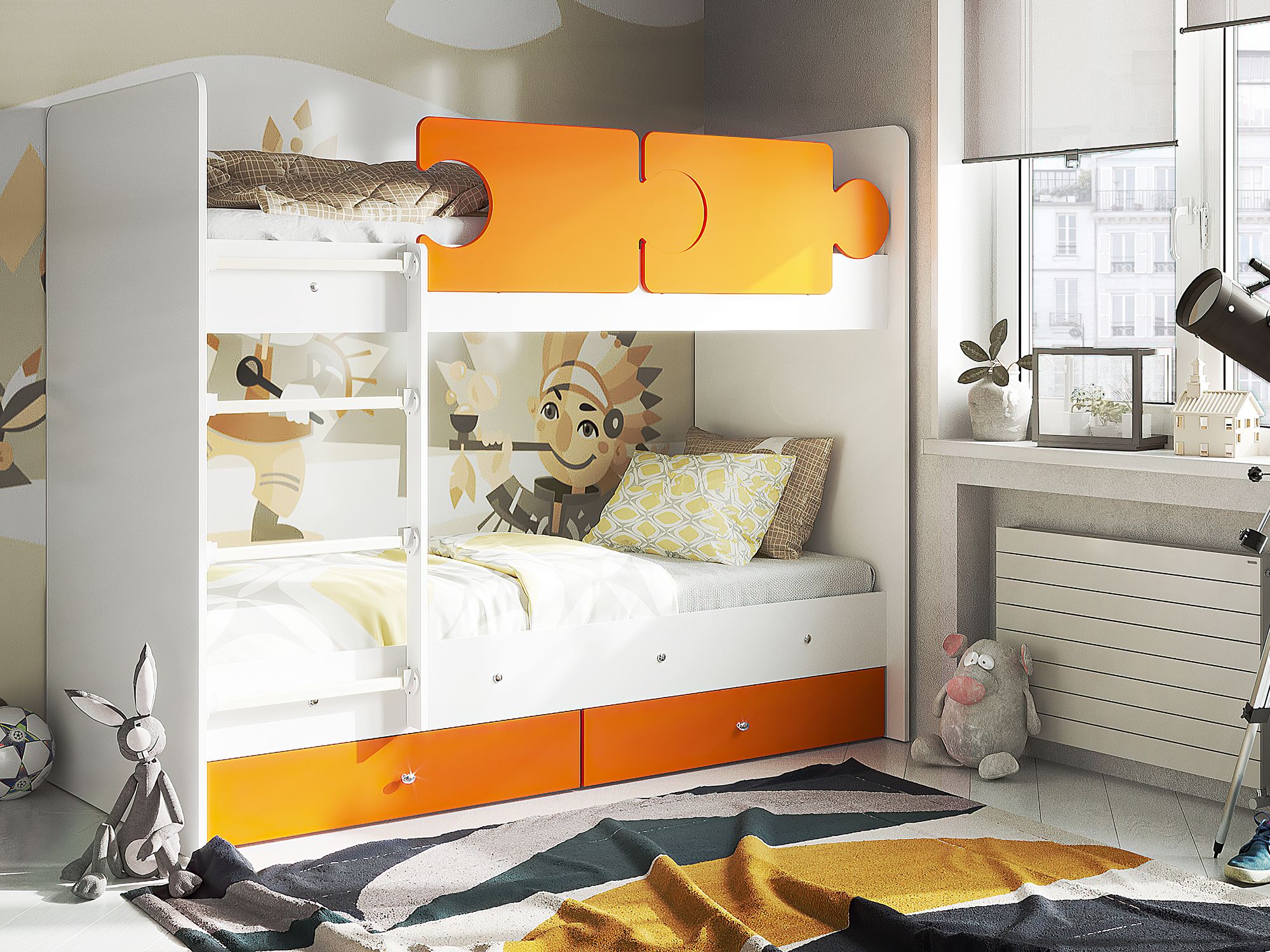 - Кровать двухъярусная Тетрис латы с бортиками белый-оранжевый
