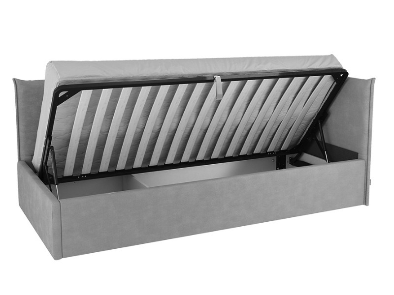 Основание подъемное входит в комплект кровати, петелька для подъема в цвет ткани на корпусе. Кровать имеет огромный ящик для хранения.