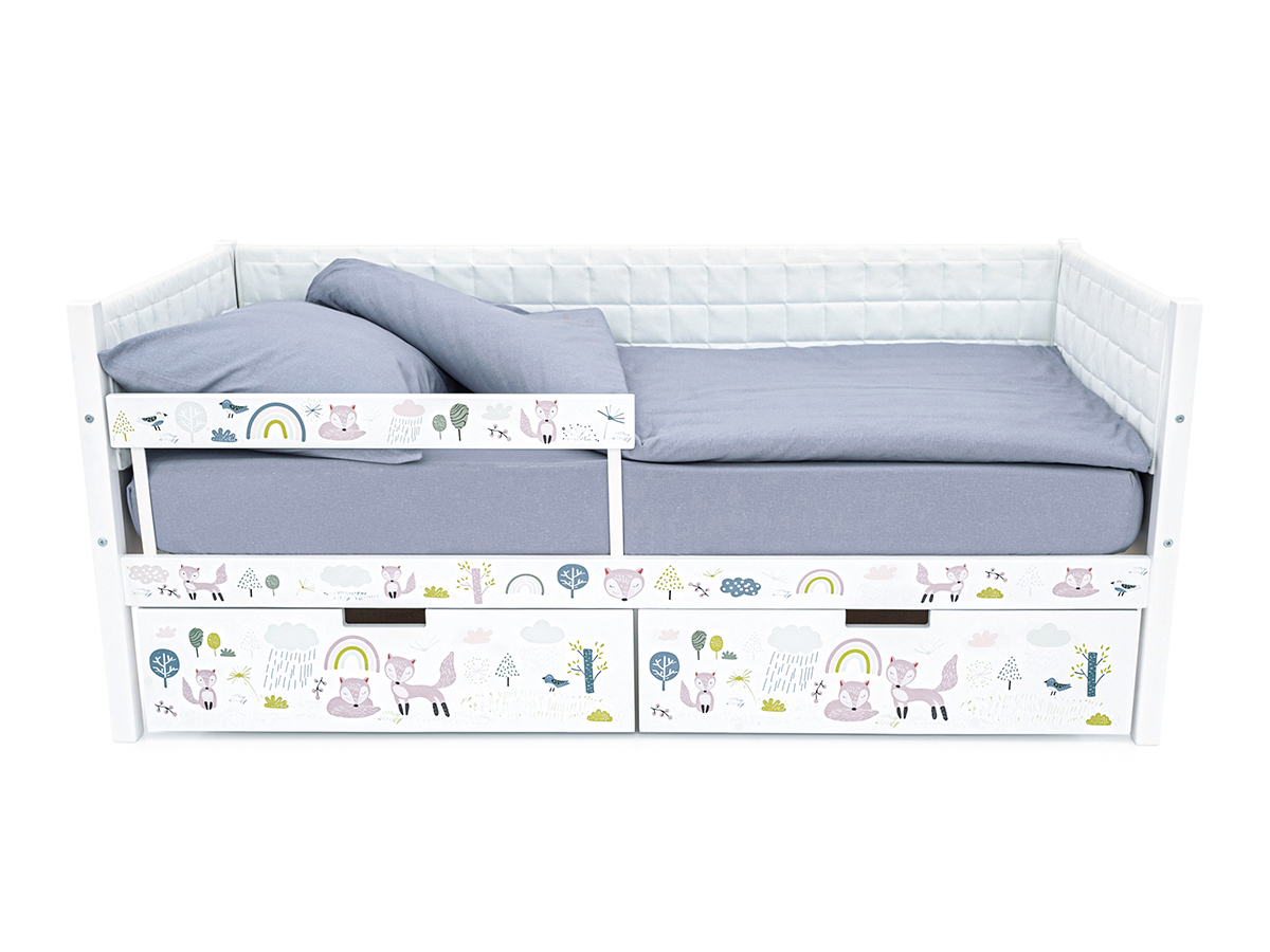 Кровать-тахта Svogen мягкая с ящиками и бортиком с фото белый/лисята