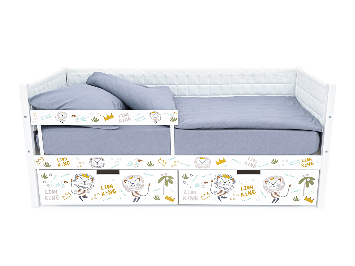Кровать-тахта Svogen мягкая с ящиками и бортиком с фото белый/львята
