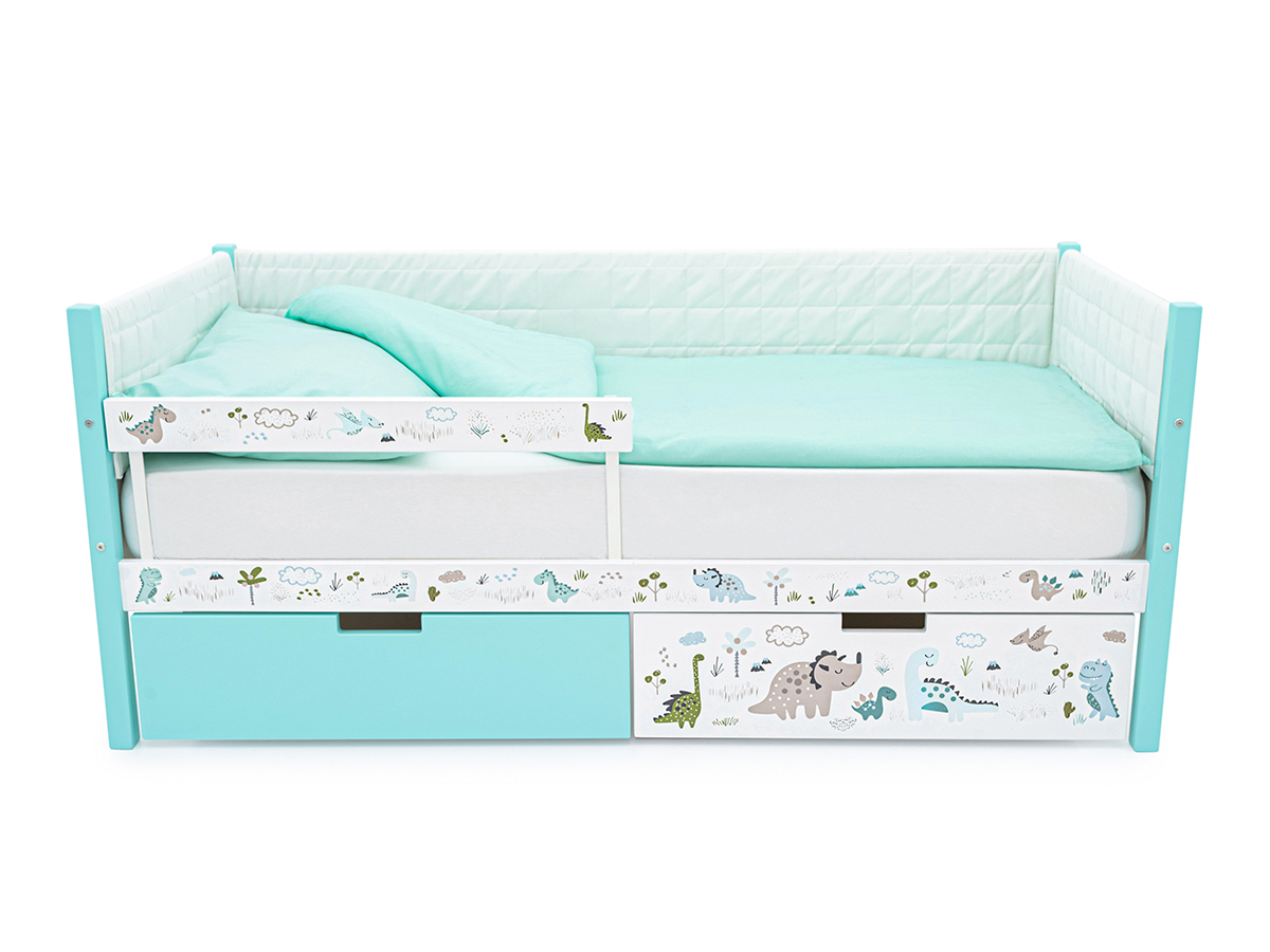 - Кровать-тахта Svogen мягкая с ящиками и бортиком с фото мятный/динозаврики