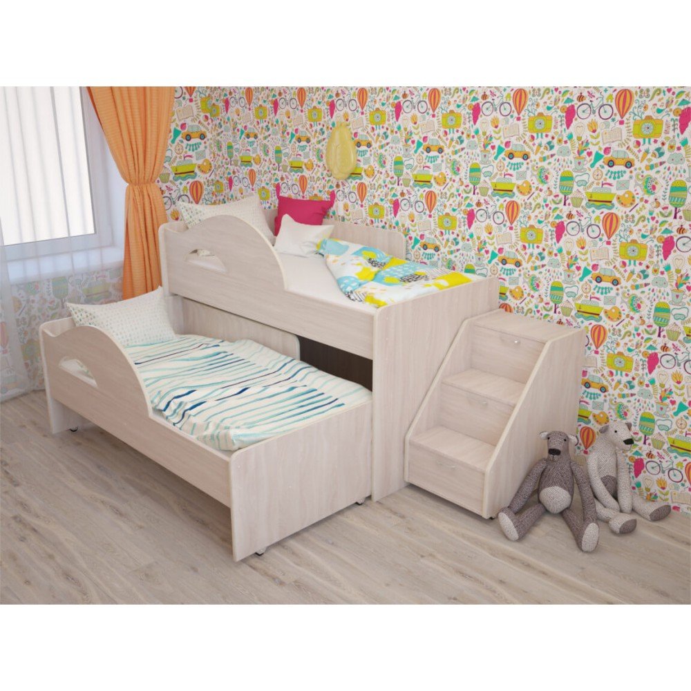 - Кровать 2-х ярусная выкатная с ящиком и лестницей Радуга дуб млечный
