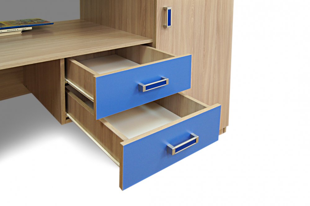 Классическая и даже немного строгая по своему дизайну модель. В комплектацию уголка школьника №2 входит шкаф (отделение с пятью полками и отделение с полкой и штангой), письменный стол с выдвижными ящиками и кровать, что делает его максимально функциональным.
