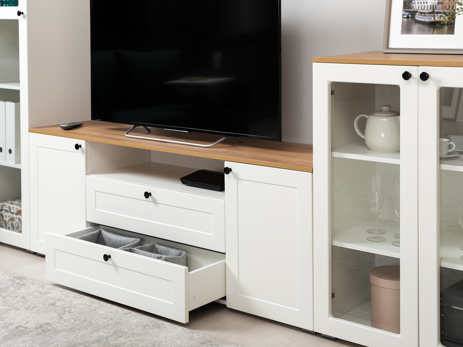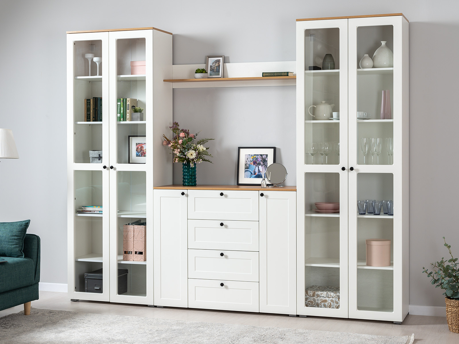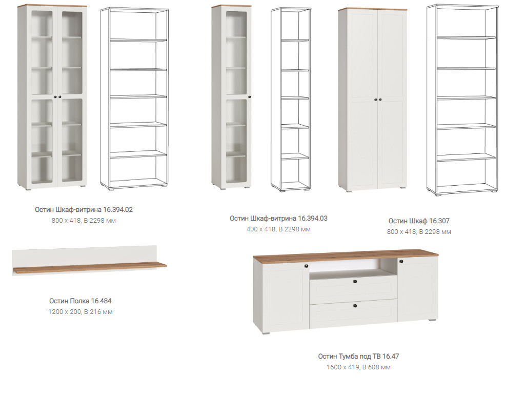 Цена указана за комплект: Полка 16.484, Тумба под ТВ 16.47, Шкаф-витрина 16.394.03, Шкаф-витрина 16.394.01