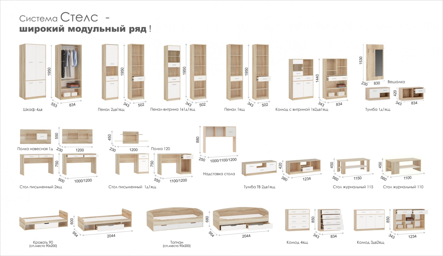 Гостиная модульная, цена зависит от комплектации. Цена указана за комплект на главном фото -Шкаф-Пенал 1в1д1ящ, Тумба ТВ 2д1ящ, Полка навесная, Комод 1в2д1ящ