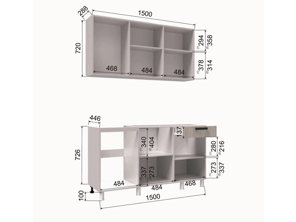 - Высота верхних шкафов, мм 720