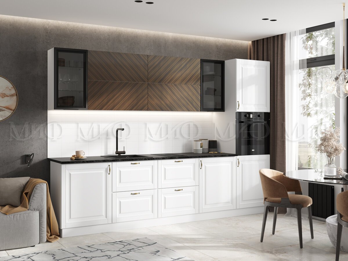 - Кухня Престиж 3000 мм Компоновка №1 Браш Вайт/Прайм орех