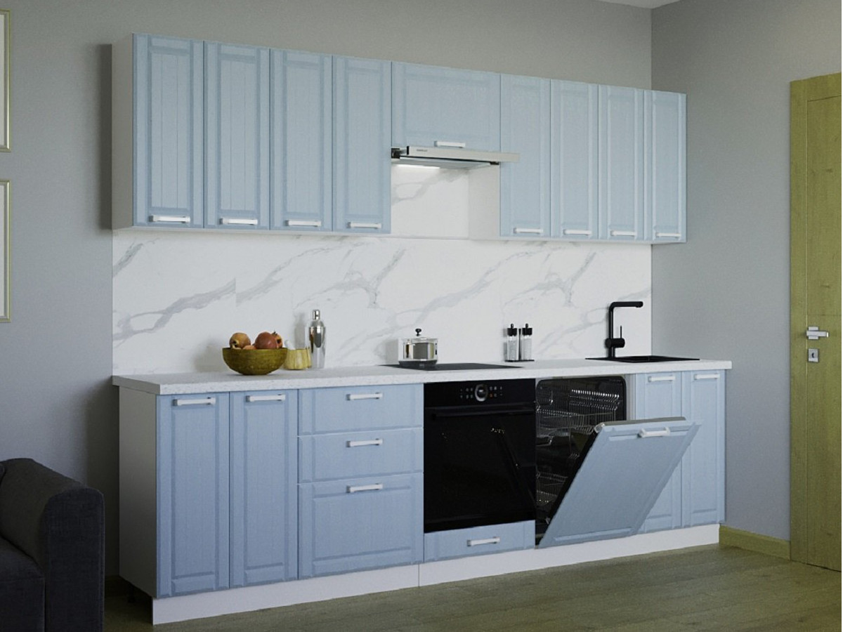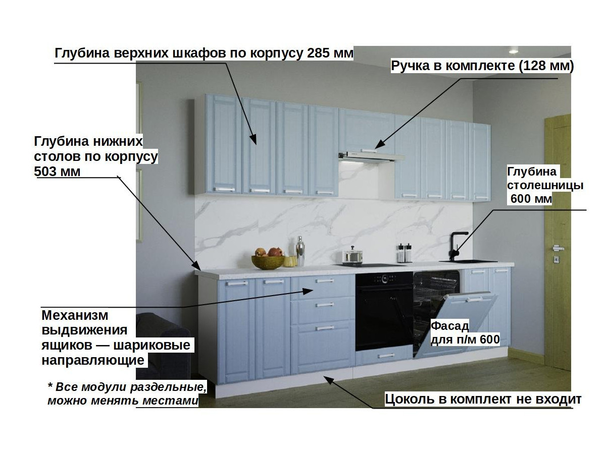Кухонная мойка, стеновая панель, посудосушитель, планки для столешницы в комплект не входят.