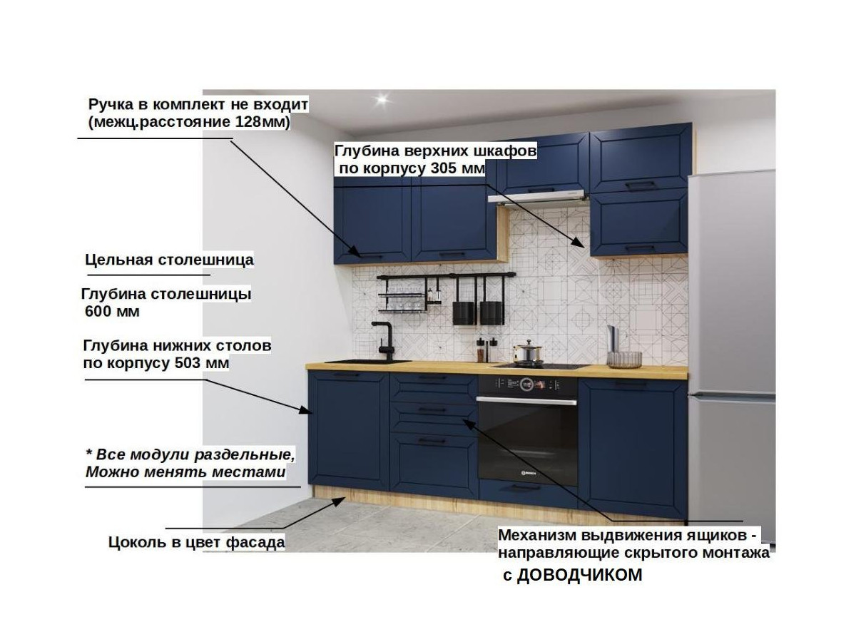 Кухонная мойка, стеновая панель, посудосушитель, планки для столешницы в комплект не входят.