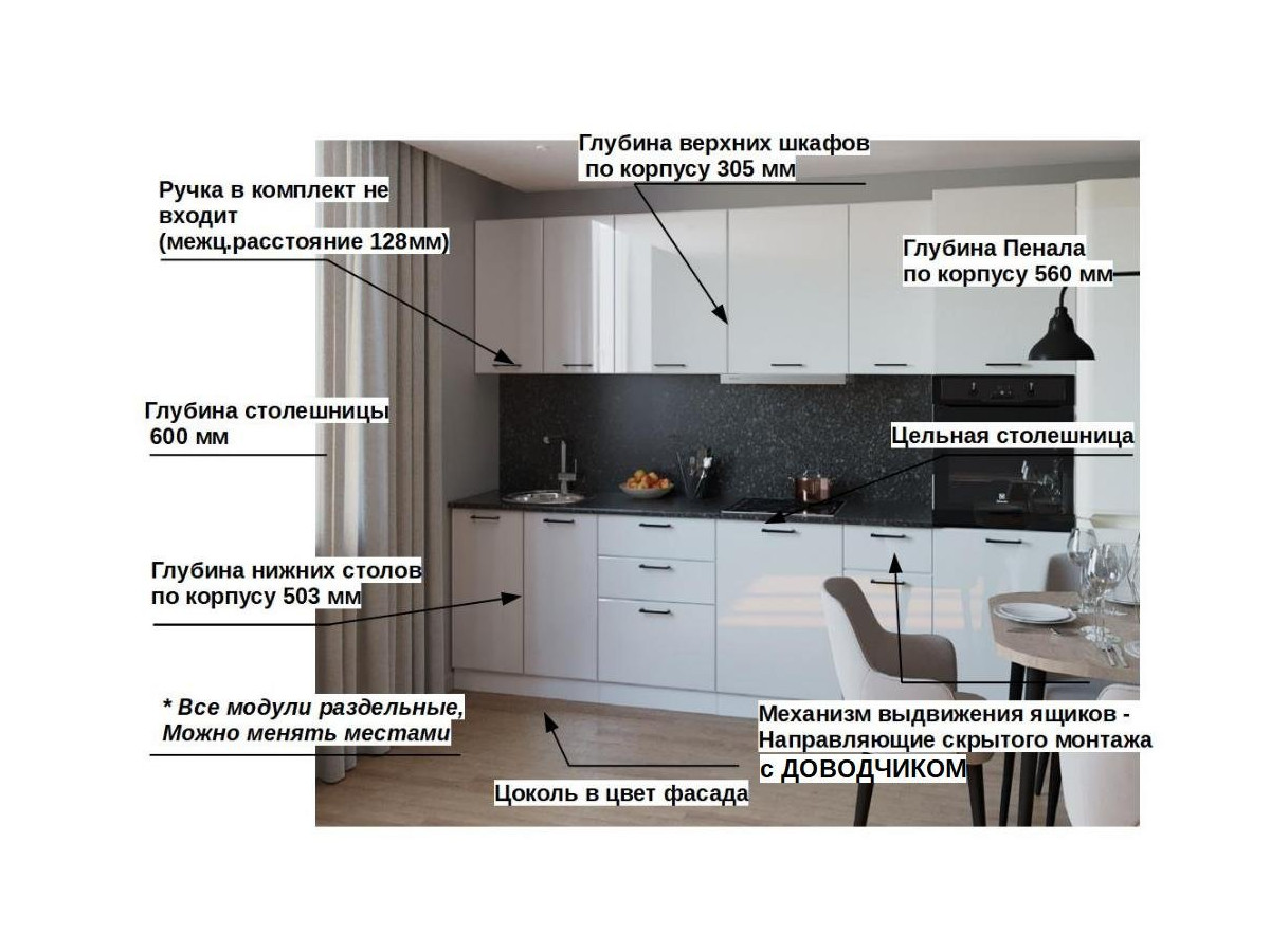Кухонная мойка, стеновая панель, посудосушитель, планки для столешницы в комплект не входят.