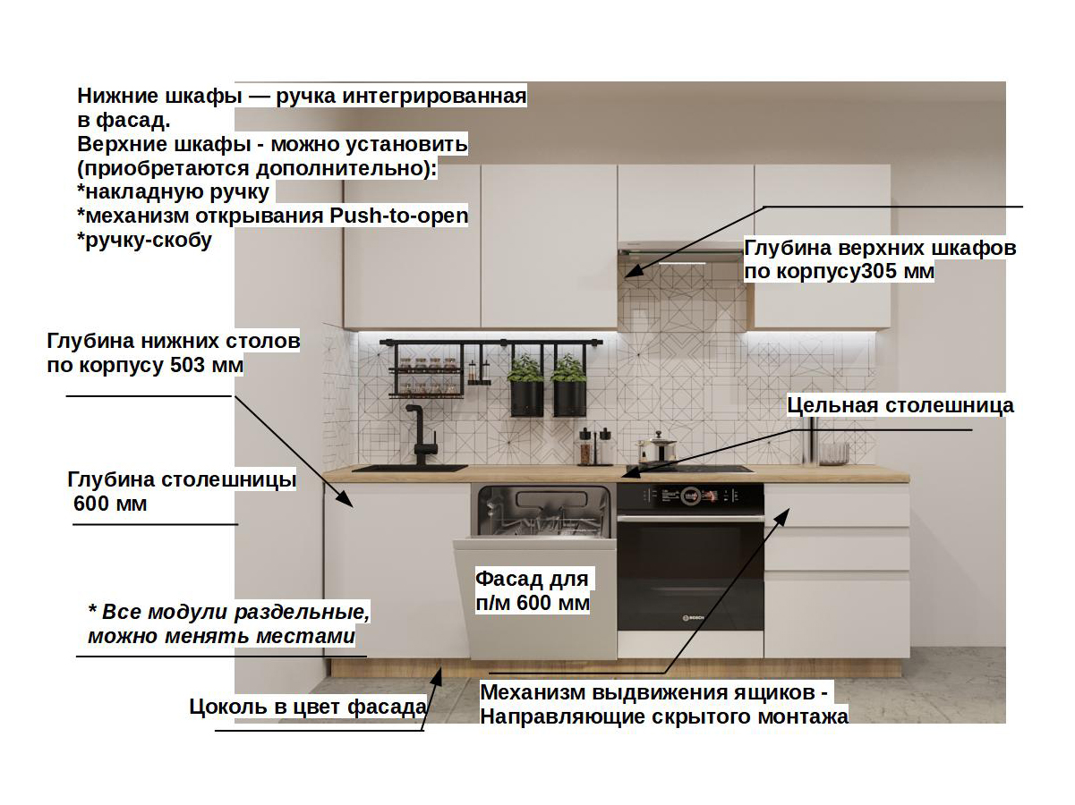 Кухонная мойка, стеновая панель, посудосушитель, планки для столешницы в комплект не входят.