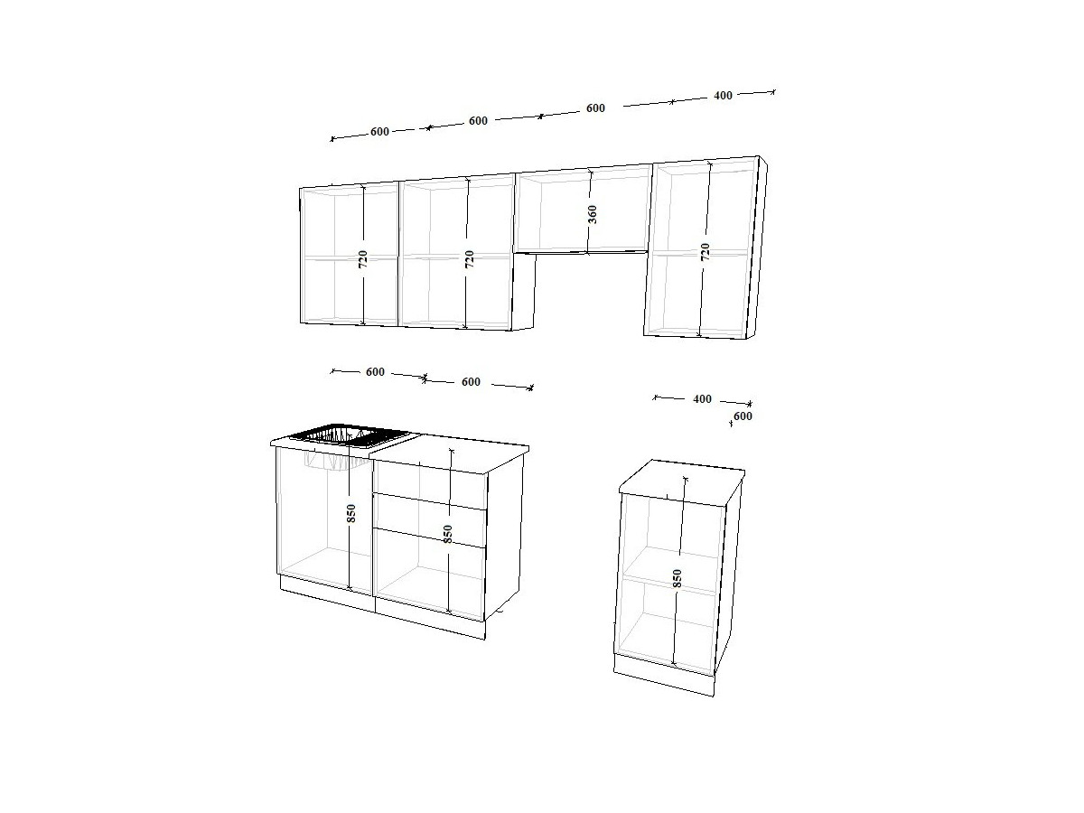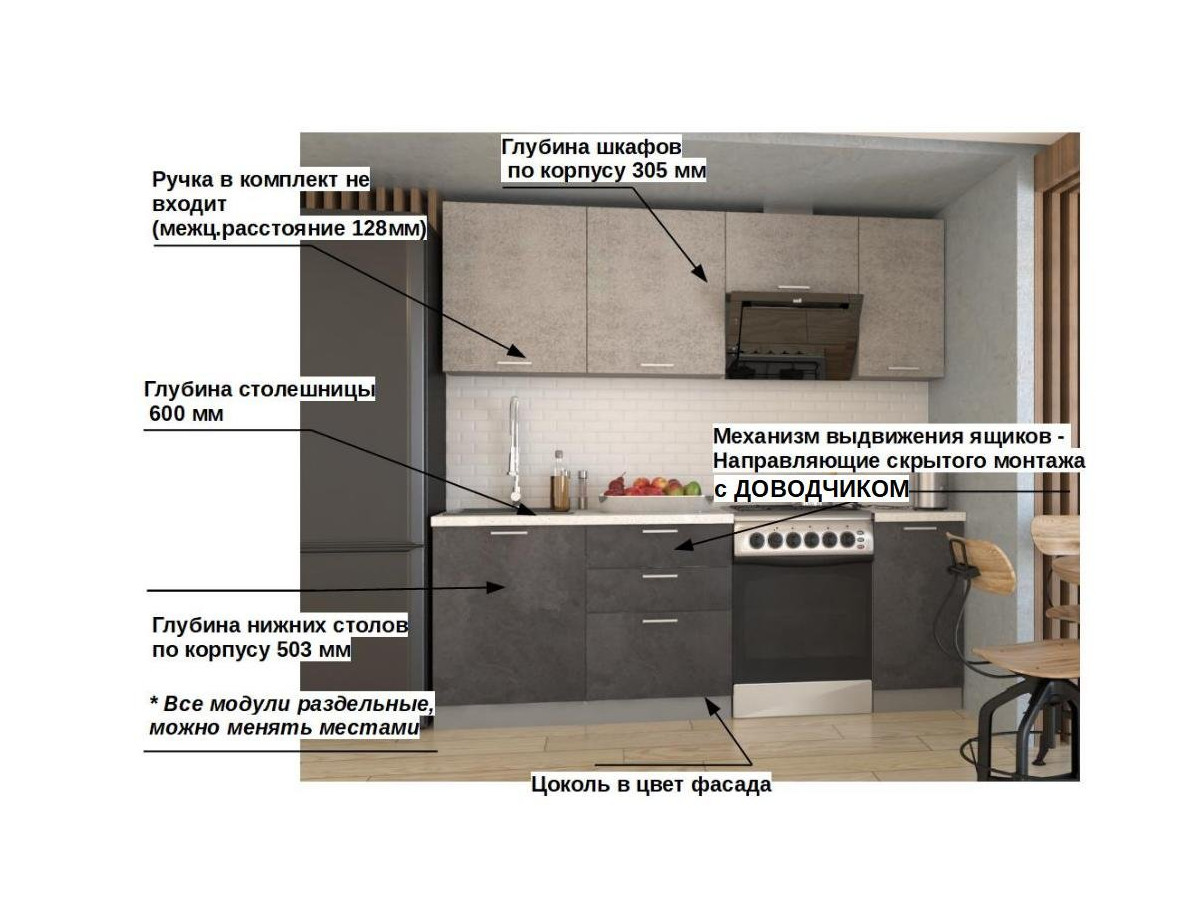 Кухонная мойка, стеновая панель, посудосушитель, планки для столешницы в комплект не входят.