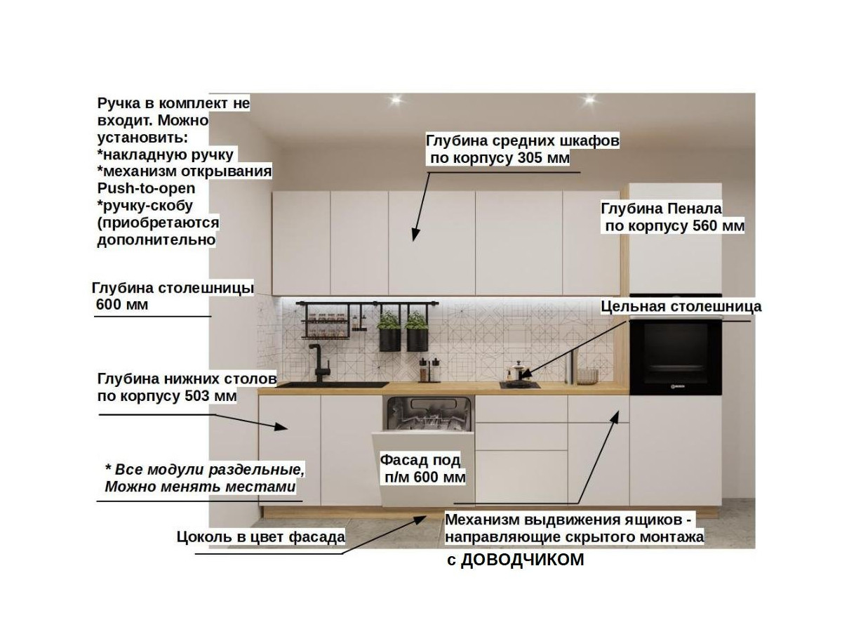 Кухонная мойка, стеновая панель, посудосушитель, планки для столешницы в комплект не входят.