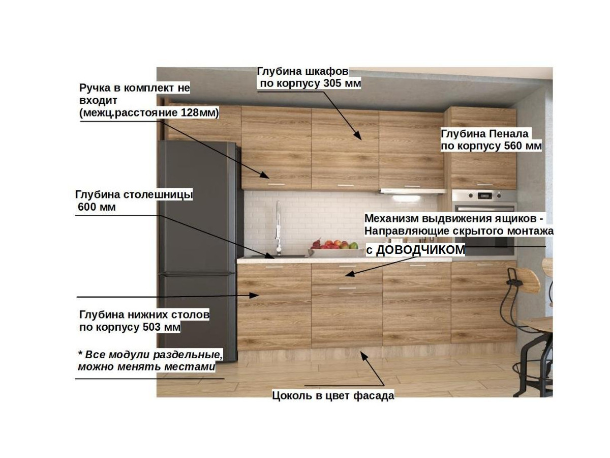Кухонная мойка, стеновая панель, посудосушитель, планки для столешницы в комплект не входят.
