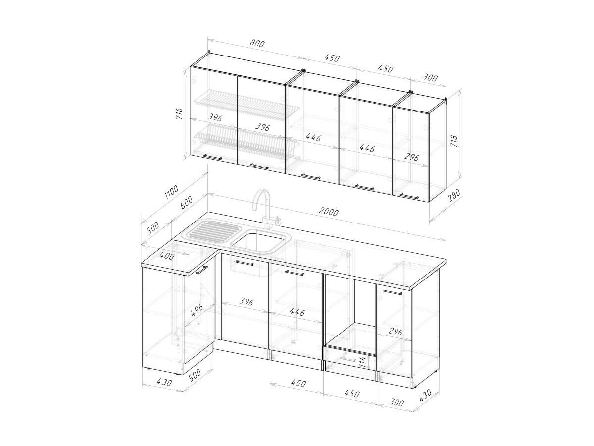 Мойка, смеситель, стеновая панель и посудосушитель в комплект гарнитура не входят.