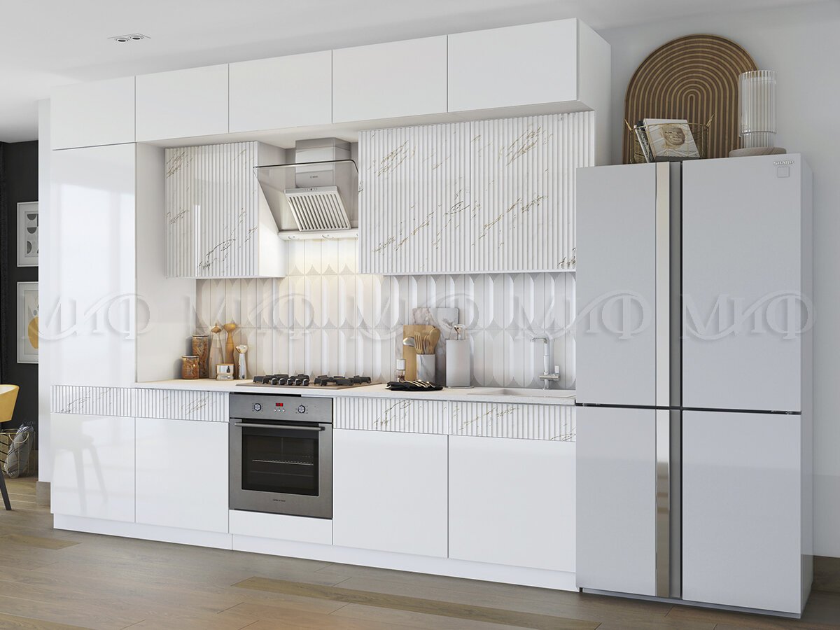 - Кухонный гарнитур Оливия 3000 Белый глянец холодный/Мрамор золото