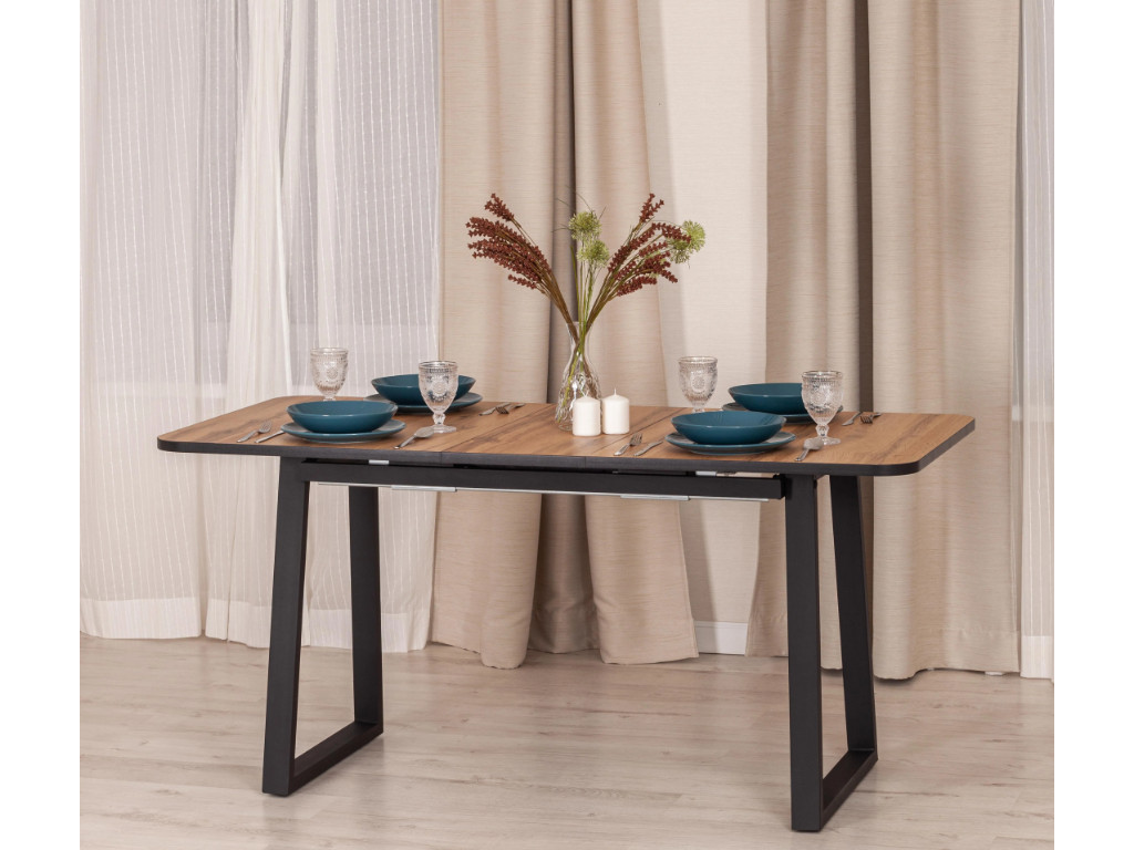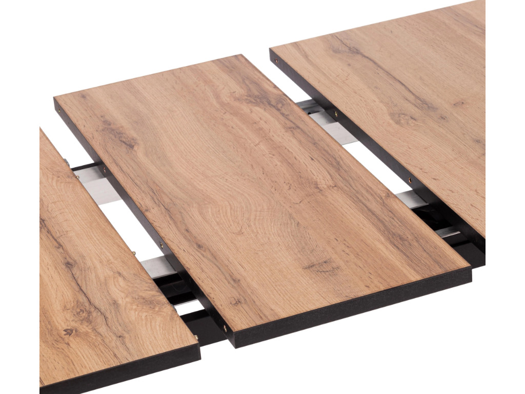 Необычная форма ножек придаст любому помещению особую индивидуальность и привлекательность. Стол подойдёт гостиной, кухни или столовой. Столешница цвета дуб вотан и вставка выполнены из ЛДСП толщиной 22 мм на лицевую поверхность которых нанесен защитный слой HPL толщиной 1 мм. HPL имеет защитное покрытие оверлей высокой степени истирания, которое повышает устойчивость поверхностей к повреждениям. Для увеличения размера стола используется автоматический механизм подъема вставки стола. Прочные черные металлические ножки окрашены порошковой краской. Ножки стола регулируются по высоте для устранения неровности пола. За столом могут разместиться от 2 до 6 человек.