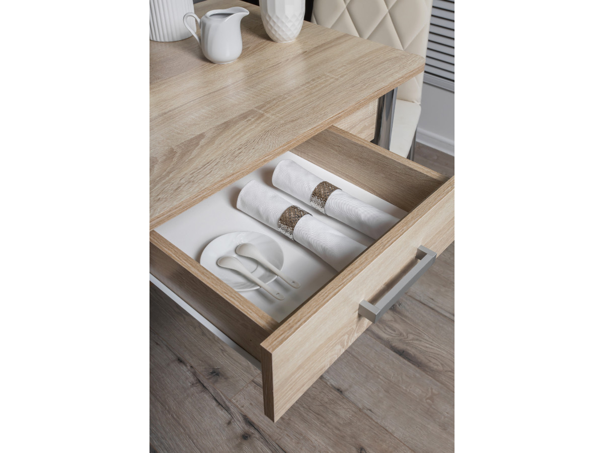 - Компактный стол, с выдвижным ящиком для столовых приборов или кухонных принадлежностей, подойдет даже для небольшой квартиры.