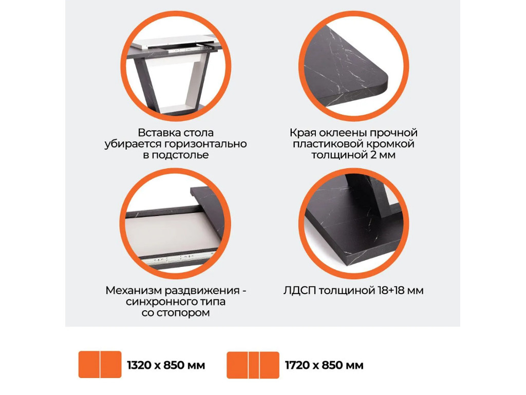 Размеры стола дают возможность с комфортом разместить от четырех до восьми человек. Вставка стола убирается горизонтально в подстолье. Края оклеены прочной пластиковой кромкой толщиной 2 мм. ЛДСП толщиной 18+18 мм. Механизм раздвижения - синхронного типа со стопором.