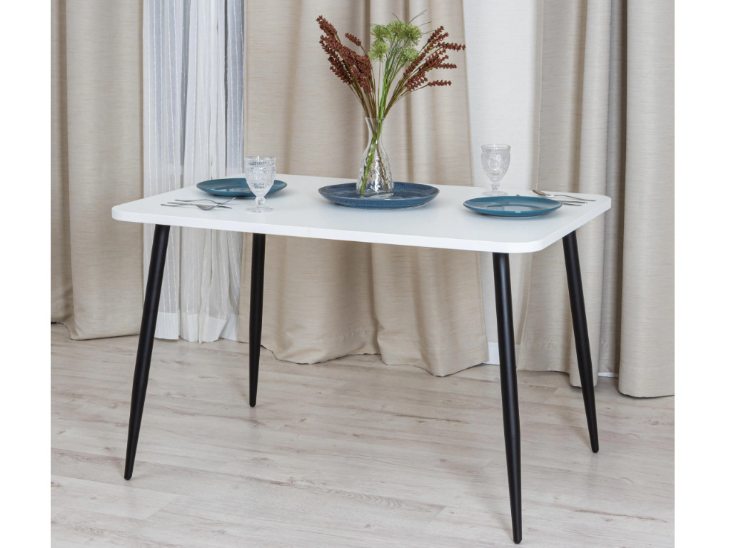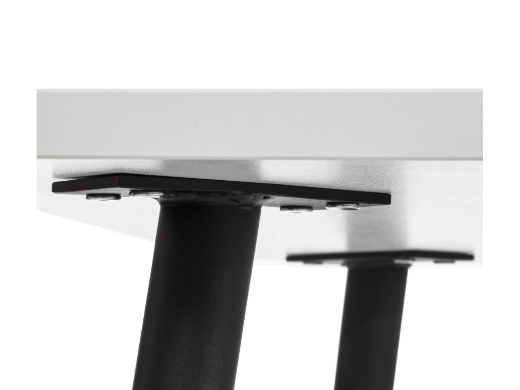 Cтолешница белого цвета выполнена из ЛДСП толщиной 25 мм, края оклеены прочной пластиковой кромкой толщиной 2 мм. Изящные тонкие ножки изготовлены из металла и окрашены в черный цвет.