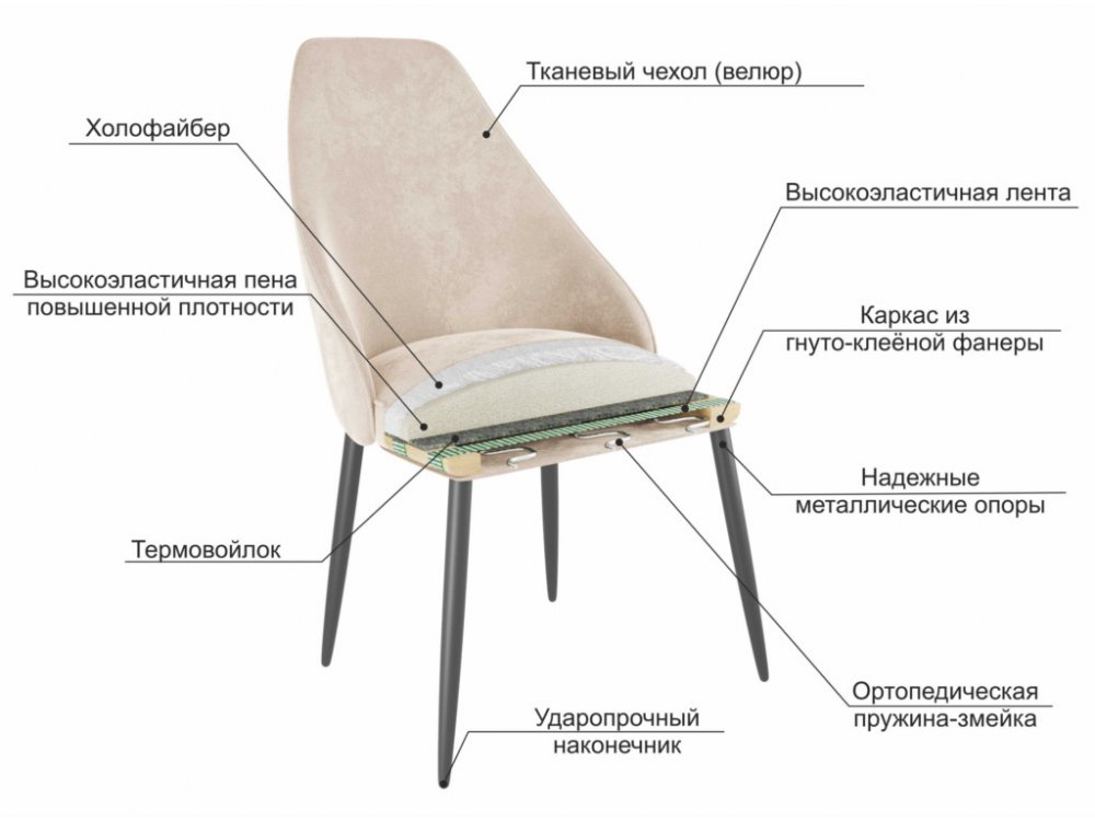 Анатомически правильная спинка и сидение с пружинящим эффектом очень комфортно при посадке. Приятный на ощупь велюр, стильный кант по периметру стула, подчеркивают плавные формы стула.