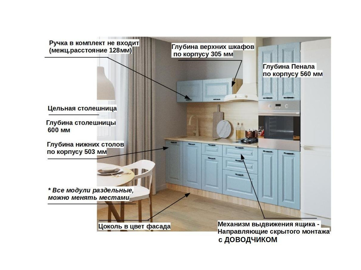 Кухонная мойка, стеновая панель, посудосушитель, планки для столешницы в комплект не входят.