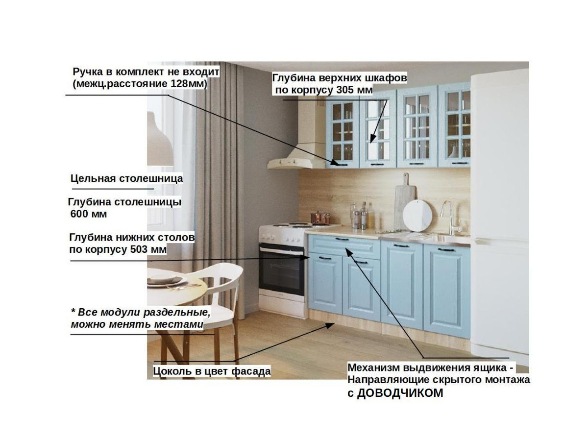 Кухонная мойка, стеновая панель, посудосушитель, планки для столешницы в комплект не входят.