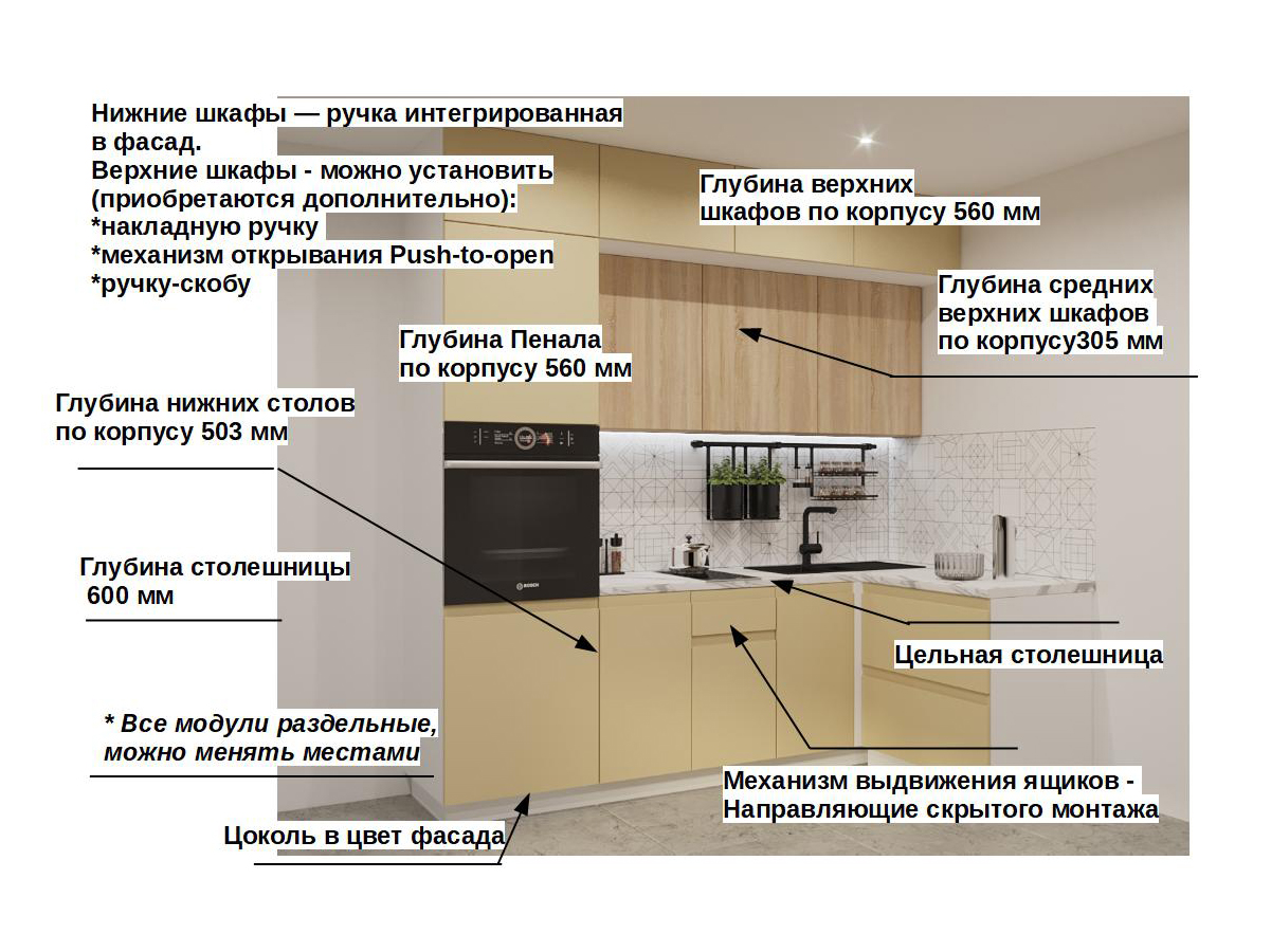 Кухонная мойка, стеновая панель, посудосушитель, планки для столешницы в комплект не входят.