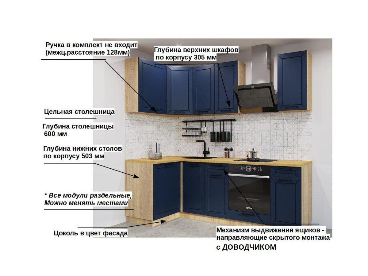 Кухонная мойка, стеновая панель, посудосушитель, планки для столешницы в комплект не входят.