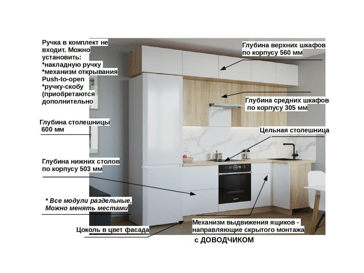 Кухонная мойка, стеновая панель, посудосушитель, планки для столешницы в комплект не входят.