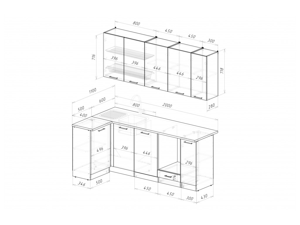 Мойка, смеситель, стеновая панель и посудосушитель в комплект гарнитура не входят.