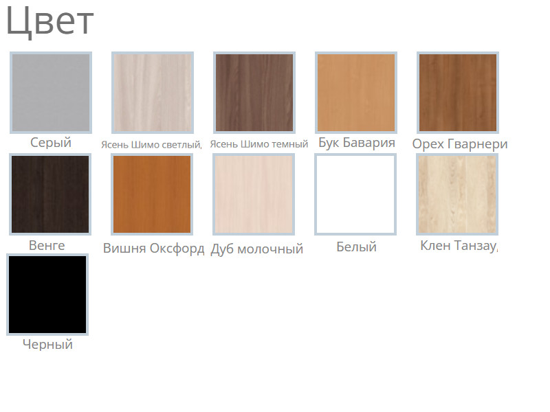 Цвета: Белый, Серый, Черный, Дуб молочный, Клен Танзау, Бук Бавария Светлый, Вишня Оксфорд, Орех Гварнери, Венге Линум, Ясень Шимо светлый, Ясень Шимо темный