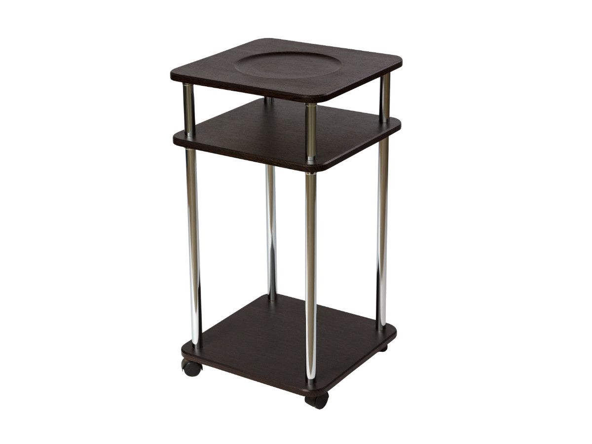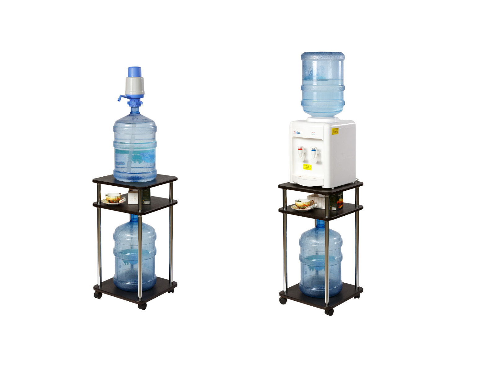 Подставка под кулер выполнена из материала МДФ 16 мм, опоры-хромированная туба. Высота подставки 750 мм, основание, полка и столешница имеют квадратную форму размером 400х400 мм. Подставка мобильна благодаря основанию на колесной опоре. Данная модель дополнена регулируемой по высоте полкой. Подставка рассчитана на кулер с бутылью и еще на одну запасную бутыль, что очень важно для экономии места дома или офиса.